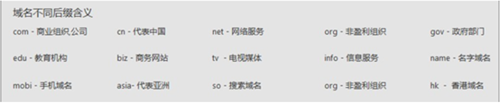 由于域名类型的不同,域名有很多种后缀。有英文的、符合中国网民输入习惯的中文域名等。同一个域名的不同后缀注册越多,越能保证域名的唯一性、排他性,起到企业品牌保护的作用。同时,注册多个域名后缀,可以让人通过更多的输入方式访问,增加网站推广的效果。